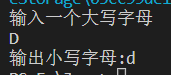 import java.util.Scanner; import javax.swing.plaf.basic.BasicInternalFrameTitlePane.SystemMenuBar; import javax.swing.text.Style; public class index { /** * @param args */ public static void main(String[] args) { Scanner scanner= new Scanner(System.in); System.out.println("输入一个大写字母"); char a=scanner.next().charAt(0); char b=(char)((int)(a)+32); System.out.println("输出小写字母:"+b); } }
