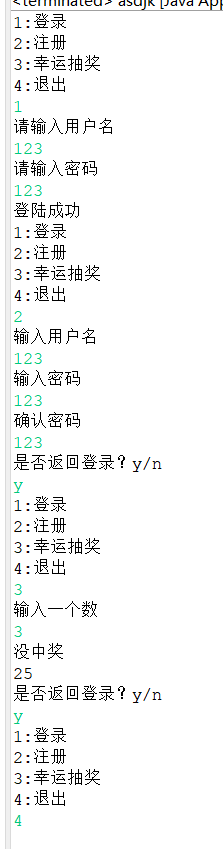 package 看作业; import java.util.Arrays; import java.util.Random; import java.util.Scanner; public class asdjk { public static void zhuce() { var scanner=new Scanner(System.in); System.out.println("输入用户名"); String name = scanner.next(); System.out.println("输入密码"); String pwd = scanner.next(); System.out.println("确认密码"); String pwd1 = scanner.next(); System.out.println("是否返回登录?y/n"); if (scanner.next().equalsIgnoreCase("y")) { caidanmain(); } } public static void denglu(){ var scanner=new Scanner(System.in); System.out.println("请输入用户名"); String name=scanner.next(); System.out.println("请输入密码"); String mm=scanner.next(); if (name.equals(mm)) { System.out.println("登陆成功"); }else { System.out.println("登录失败"); } caidanmain(); } public static void choujiang() { Random r=new Random(); var scanner=new Scanner(System.in); int rand=r.nextInt(100); System.out.println("输入一个数"); int a=scanner.nextInt(); if(rand==a) { System.out.println("中奖了"); }else { System.out.println("没中奖"); } System.out.println(rand); System.out.println("是否返回登录?y/n"); if (scanner.next().equalsIgnoreCase("y")) { caidanmain(); } } public static void caidanmain() { var scanner=new Scanner(System.in); System.out.println("1:登录"); System.out.println("2:注册"); System.out.println("3:幸运抽奖"); System.out.println("4:退出"); int i=scanner.nextInt(); switch (i) { case 1: denglu(); break; case 2: zhuce(); break; case 3: choujiang(); break; case 4: break; } } public static void main(String[] args) { caidanmain(); } }