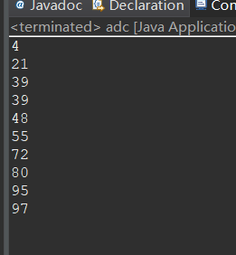 package 阿萨德; import java.util.Arrays; import java.util.Scanner; public class adc { public static void num(){ int[]a=new int[10]; for (int i = 0; i < a.length; i++) { a[i]=(int)(Math.random()*101); } Arrays.sort(a); for (int i = 0; i < a.length; i++) { System.out.println(a[i]); } } public static void main(String[] args) { num(); } }