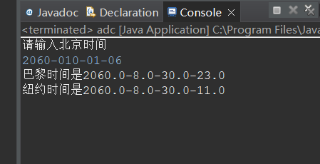 package 阿萨德; import java.text.ParseException; import java.text.SimpleDateFormat; import java.util.Calendar; import java.util.Date; import java.util.Scanner; public class adc { public static void main(String[] args) throws ParseException { System.out.println("请输入北京时间"); Scanner sc=new Scanner(System.in); String S=sc.next(); SimpleDateFormat si = new SimpleDateFormat("yyyy-MM-dd-HH"); Date parse = si.parse(S); Calendar c = Calendar.getInstance(); c.setTime(parse); c.add(c.HOUR_OF_DAY, -7); double y1 = c.get(c.YEAR); double m1 = c.get(c.MONTH); double d1 = c.get(c.DAY_OF_MONTH); double h1 = c.get(c.HOUR_OF_DAY); c.add(c.HOUR_OF_DAY, -12); double y2 = c.get(c.YEAR); double m2 = c.get(c.MONTH); double d2 = c.get(c.DAY_OF_MONTH); double h2 = c.get(c.HOUR_OF_DAY); System.out.println("巴黎时间是" + y1 + "-" + m1 + "-" + d1 + "-" + h1); System.out.println("纽约时间是" + y2 + "-" + m2 + "-" + d2 + "-" + h2); } }