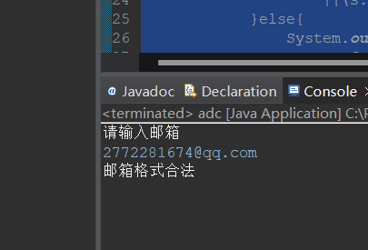 package 阿萨德; import java.util.Scanner; public class adc { public static boolean testMail(){ Scanner in = new Scanner(System.in); System.out.println("请输入邮箱"); String s = in.next(); if(s.indexOf("@")==-1||s.indexOf(".")==-1){ System.out.println("邮箱地址中不包含@或."); return false; } if(s.indexOf("@")!=s.lastIndexOf("@")||s.indexOf(".")!=s.lastIndexOf(".")){ System.out.println("邮箱地址中含有多了@或."); return false; } if(s.indexOf("@")>s.lastIndexOf(".")){ System.out.println("邮箱地址中.出现在@的前面"); return false; } for(int i=0;i<s.indexOf("@");i++){ if( (s.charAt(i)>='a'&&s.charAt(i)<='z')||(s.charAt(i)>='A'&&s.charAt(i)<='Z') ||(s.charAt(i)>='0'&&s.charAt(i)<='9')){ }else{ System.out.println("用户名里有其他字符"); return false; } } return true; } public static void main(String[] args) { if(adc.testMail()){ System.out.println("邮箱格式合法"); }else{ System.out.println("邮箱格式不合法"); } } }