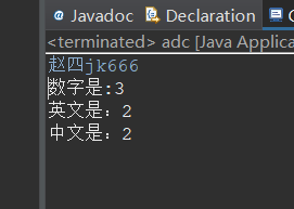 import java.util.Scanner; public class adc { public static void main(String[] args) { Scanner in =new Scanner (System.in); String s = in.next(); int num=0,eng=0,china=0; for(int i=0;i<s.length();i++) { if(s.charAt(i)>='0'&&s.charAt(i)<='9') { num++; }else if ((s.charAt(i)>='a'&&s.charAt(i)<='z')||(s.charAt(i)>='A'&& s.charAt(i)<='Z')) { eng++; }else if ((19968<=s.charAt(i)&&s.charAt(i)<40623)) { china++; } } System.out.println("数字是:"+num); System.out.println("英文是:"+eng); System.out.println("中文是:"+china); } }
