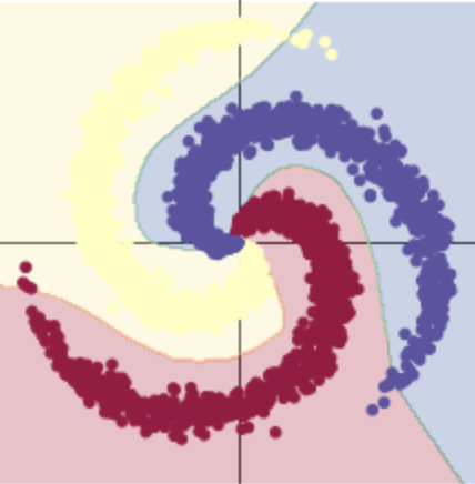 考虑逻辑回归的情况。如果将用于分类的逻辑回归用于此数据,它将创建一组线性平面(决策边界),以尝试将数据分为其类。该解决方案的问题在于,在每个区域中,都有属于多个类别的点。螺旋的分支越过线性决策边界,这不是一个很好的解决方案。我们对输入空间进行转换,以使数据被迫线性分离。在训练神经网络来执行此操作的过程中,它学习的决策边界将尝试适应训练数据的分布。