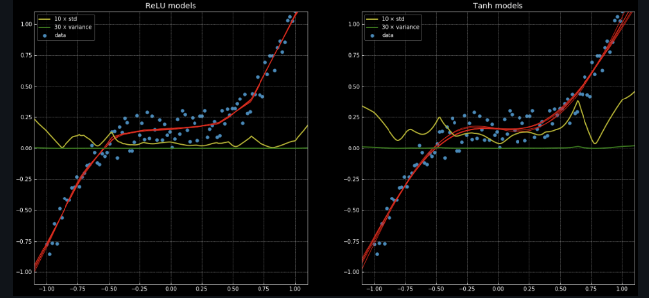 - 左侧是使用 ReLU 激活函数的网络得到的结果,右侧是使用 Tanh 激活函数的网络得到的结果。前者是分段线性函数,而后者是连续且平滑的回归。