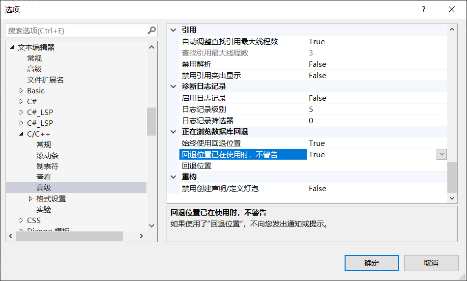 工具->选项->文本编辑器->C/C++->高级->回退位置->将前两项: