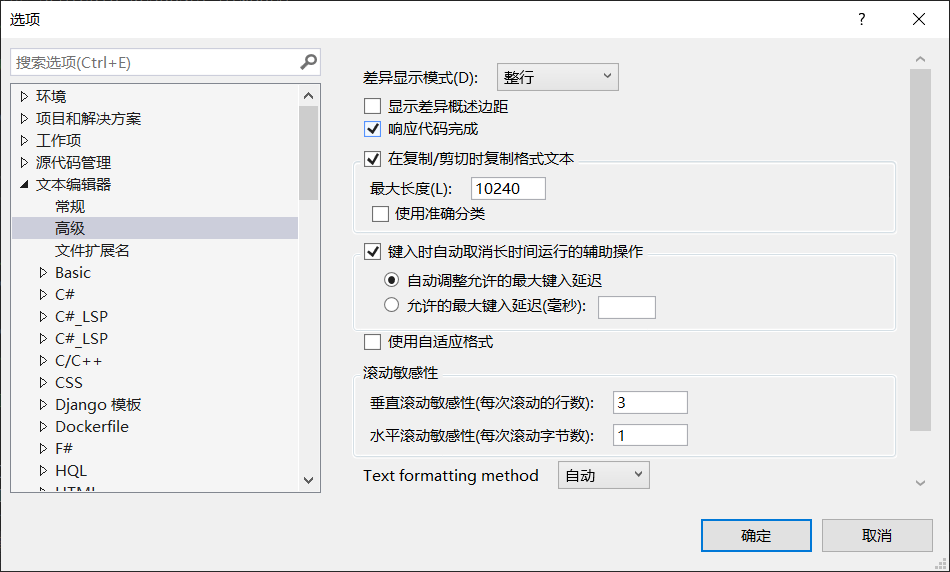 而在vs2019中这么设置却没有生效。还需要修改参数,取消“使用自适应格式”,位置在工具->选项->文本编辑器->高级。