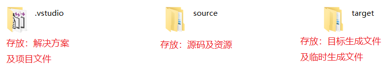 目标是实现项目文件、源码、资源、目标生成文件和临时生成文件分开存放,将项目文件放在一个文件夹中,源码和资源放在另一个文件夹中,目标生成文件和临时生成文件放在再另一个文件夹中。见下图: