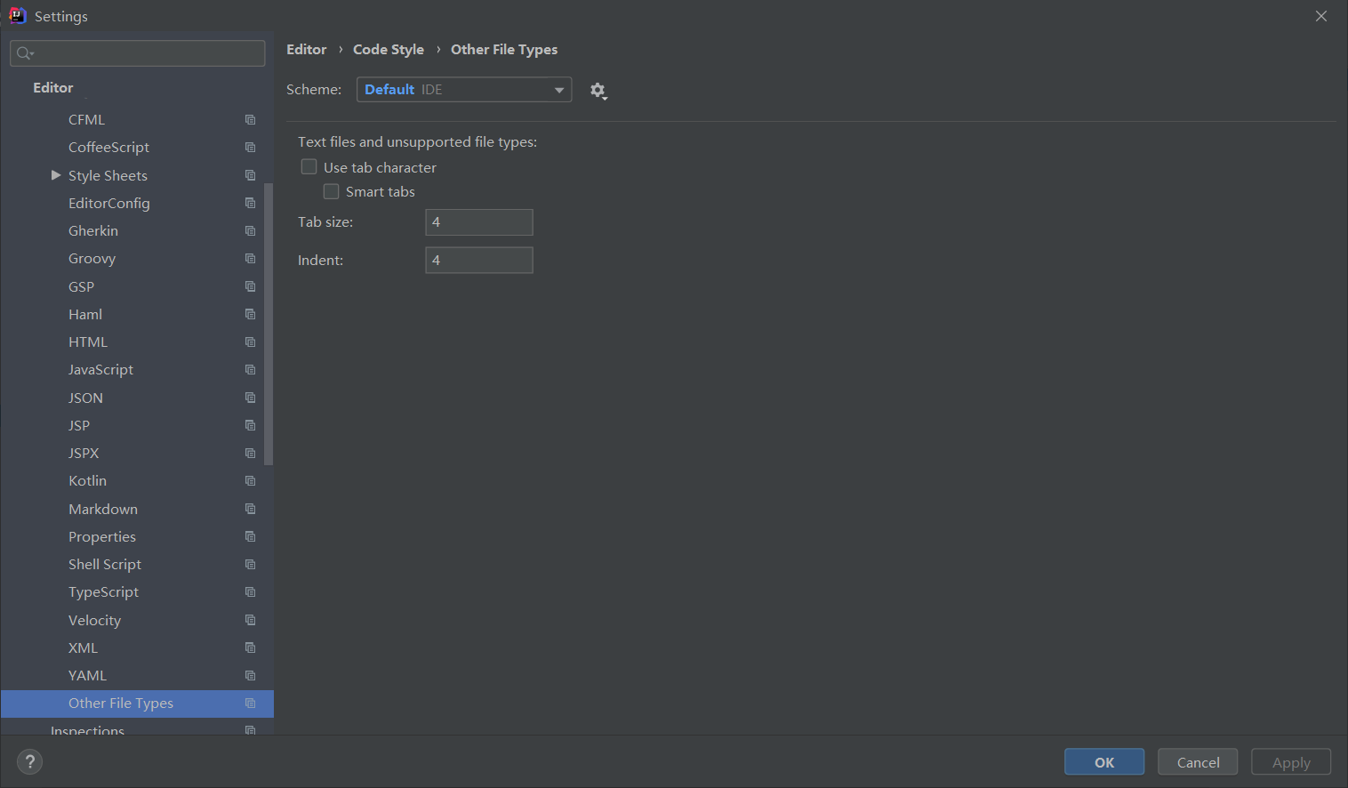 如果需要用到多种编程语言,需要把它们一一设置。对于ftl等没有直接列出的格式,可以选择Ohers File Types,将Use tab character和Smart tabs前的checkebox设为不勾选,具体见下图: