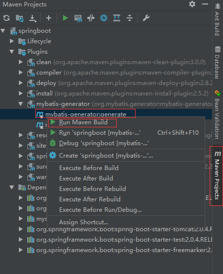 如果你使用的是IDEA,点击最右侧的Maven Projects => 点击mybatis-generator => 右键mybatis-generator:generate => Run Maven Build,如下图所示: