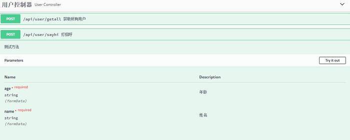@RestController @RequestMapping("/api/user") @Api(tags = "用户控制器") public class UserController { @ApiOperation(value = "打招呼", notes = "测试方法") @ApiImplicitParam(name = "name", value = "姓名") @RequestMapping(value = "/sayhi", method = RequestMethod.POST) public String sayHi(String name) { return "Hello," + name; } @ApiOperation(value = "获取所有用户", notes = "查询分页数据") @RequestMapping(value = "/getall", method = RequestMethod.POST) public String getAll() { return "所有用户"; } }