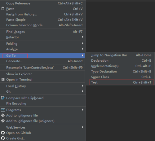 在Idea里面可以快速的添加测试的方法,只需要在要测试的类里面右键选择“GoTo”点击“Test”,选择你需要测试的代码,点击生成即可,如果是Windows 用户可以使用默认快捷键“Ctrl + Shift + T”,效果如下图: