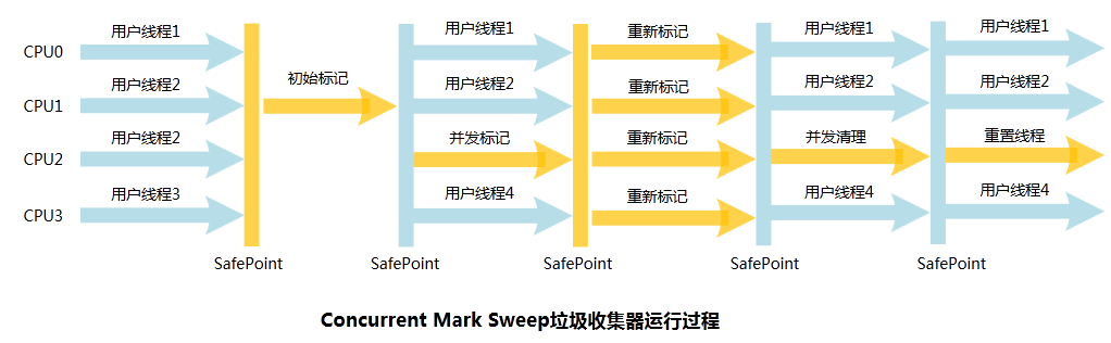 注意:CMS 收集器中,当老生代中的内存使用超过一定的比例时,系统将会进行垃圾回收;当剩余内存不能满足程序运行要求时,系统将会出现 Concurrent Mode Failure,临时采用 Serial Old 算法进行清除,此时的性能将会降低。