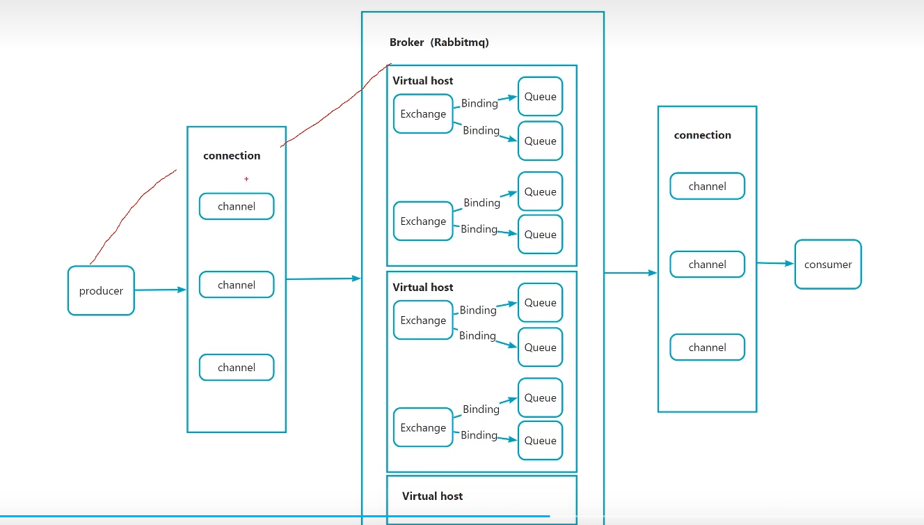 - Broker是rabbitMQ的一个实体,接受分发消息的应用,一个broker可以有多个vhost,vhost下面是exchange交换机,一个vhost可以有多个exchange,一个exchange可以有多个队列,在同一个vhost中交换机和队列不能重名
