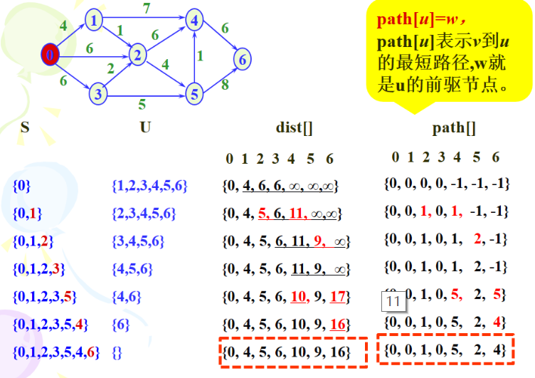path[]数组存储前驱顶点,初值或无路径为=1,path[2]=5表示顶点2的前驱顶点是5