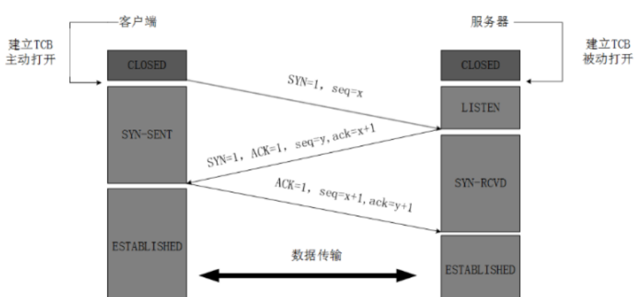1、客户端发送建立TCP连接的请求报文,其中报文中包含seq序列号,是由发送端随机生成的,并且将报文中的SYN字段置为1,表示需要建立TCP连接。(SYN=1,seq=x,x为随机生成数值);