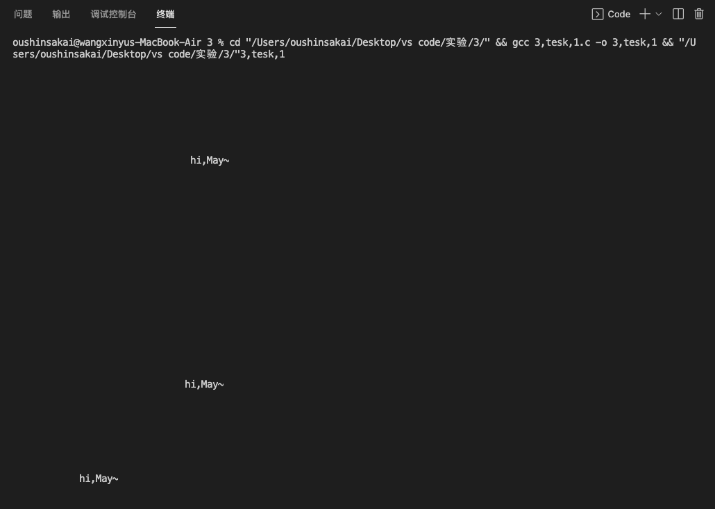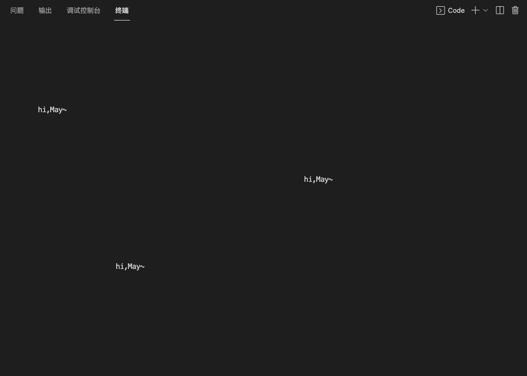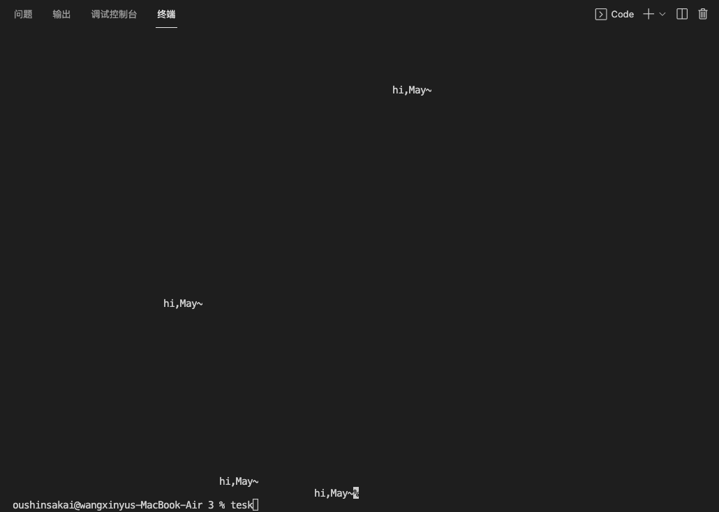 #include <stdio.h> #include <stdlib.h> #include <time.h> #include <unistd.h> #define N 80 void printText(int line,int col,char text[]); void printSpaces(int n); void printBlanklines(int n); int main() { int line,col,i; char text[N]="hi,May~"; srand (time(0)); for ( i = 1; i <=10; i++) { line=rand()%25; col=rand()%80; printText(line,col,text); sleep(1); } return 0; } void printSpaces(int n) { int i; for ( i = 1; i <=n; i++) { printf(" "); } } void printBlanklines(int n) { int i; for ( i = 1; i <=n; i++) { printf("\n"); } } void printText(int line,int col,char text[]) { printBlanklines(line-1); printSpaces(col-1); printf("%s",text); }