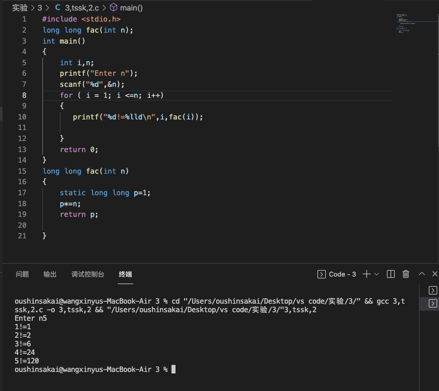 #include <stdio.h> long long fac(int n); int main() { int i,n; printf("Enter n"); scanf("%d",&n); for ( i = 1; i <=n; i++) { printf("%d!=%lld\n",i,fac(i)); } return 0; } long long fac(int n) { static long long p=1; p*=n; return p; }