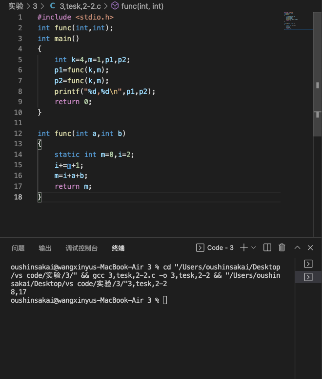 #include <stdio.h> int func(int,int); int main() { int k=4,m=1,p1,p2; p1=func(k,m); p2=func(k,m); printf("%d,%d\n",p1,p2); return 0; } int func(int a,int b) { static int m=0,i=2; i+=m+1; m=i+a+b; return m; }