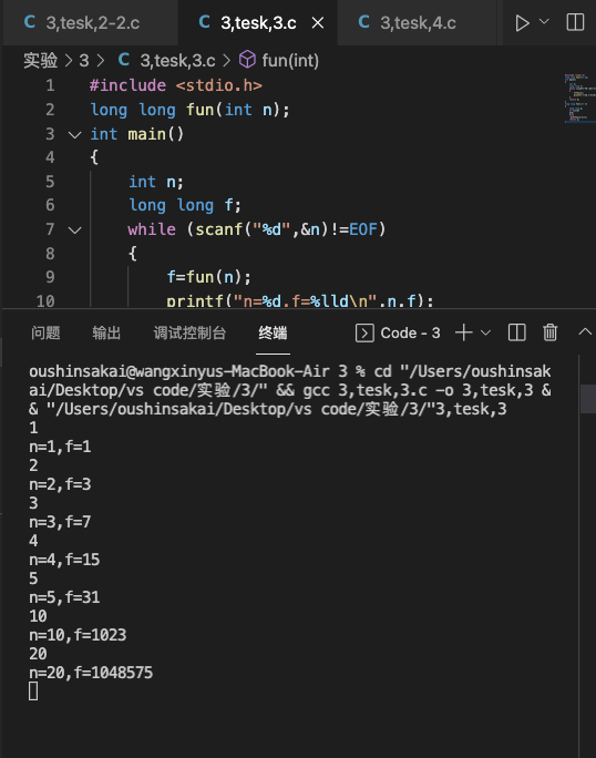#include <stdio.h> long long fun(int n); int main() { int n; long long f; while (scanf("%d",&n)!=EOF) { f=fun(n); printf("n=%d,f=%lld\n",n,f); } return 0; } long long fun(int n) { long long p; if (n==0) p=0; else p=2*fun(n-1)+1; return p; }