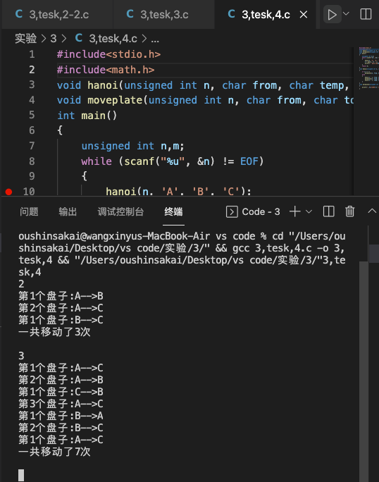 #include<stdio.h> #include<math.h> void hanoi(unsigned int n, char from, char temp, char to); void moveplate(unsigned int n, char from, char to); int main() { unsigned int n,m; while (scanf("%u", &n) != EOF) { hanoi(n, 'A', 'B', 'C'); m = pow(2, n) - 1; printf("一共移动了%d次\n\n", m); } return 0; } void hanoi(unsigned int n, char from, char temp, char to) { if (n == 1) moveplate(n, from, to); else { hanoi(n - 1, from, to, temp); moveplate(n, from, to); hanoi(n - 1, temp, from, to); } } void moveplate(unsigned int n, char from, char to) { printf("第%u个盘子:%c-->%c\n", n, from, to); }