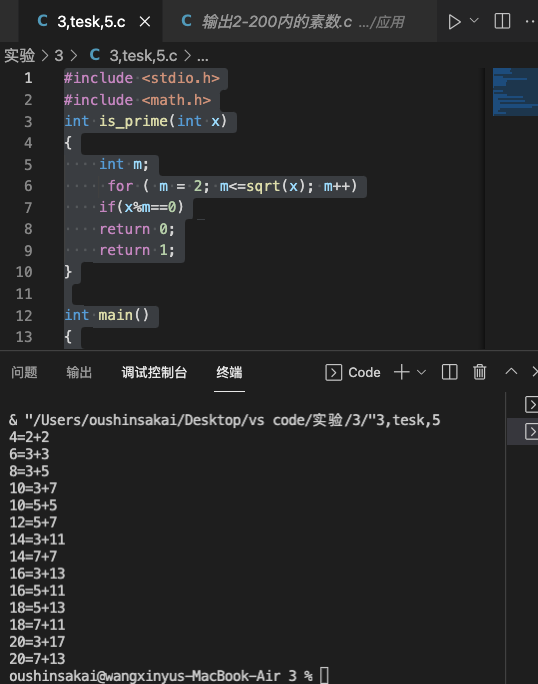 #include <stdio.h> #include <math.h> int is_prime(int x) { int m; for ( m = 2; m<=sqrt(x); m++) if(x%m==0) return 0; return 1; } int main() { int j,i,n; for ( j = 4; j <=20; j+=2) { for ( i = 2; i <=j/2; i++) { if(is_prime(i)==1&&is_prime(j-i)==1) printf("%d=%d+%d\n",j,i,j-i); } } return 0; }