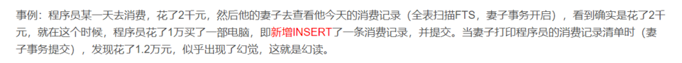首先,需要知道的是,读 未提交,一个事务是能够读取到另一个事务还未提交的修改。所以就会造成脏读这种现象。例子:我收到短信老板给我发了12k的工资,老板发现多给我发了1w的工资,然后回滚,我就只收到2k的工资。这种现象就是脏读。