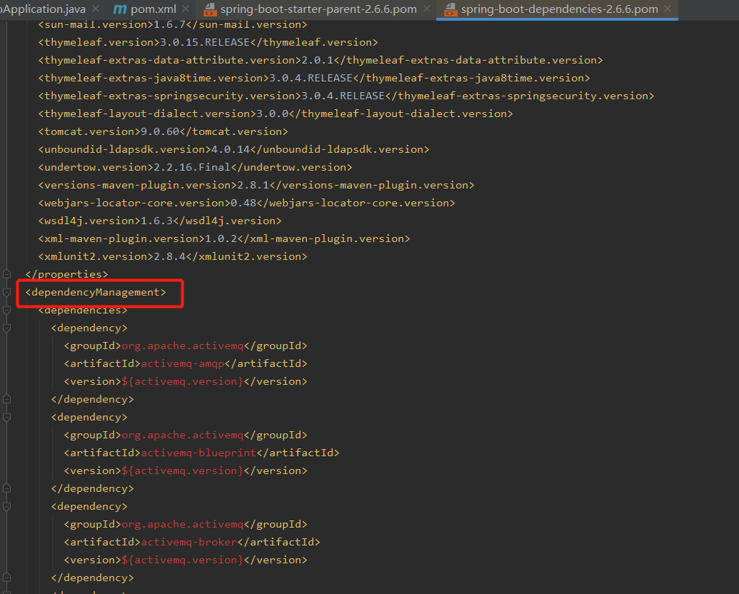可以看到里面规定了所有的依赖,并且用<dependencyManagement>标签进行版本管理,如果不知道这个标签的作用,自己百度查。