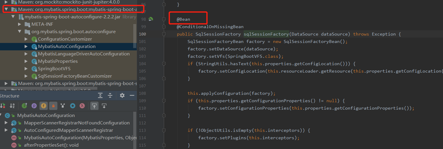 springboot中的mybatis-spring-boot-starter依赖中,已经通过@Bean进行了配置,在项目启动的时候,自动会注入到IOC容器中。
