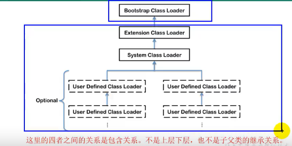 小tips:从这里就可以看出来,他们的关系不是继承关系,类似于一种上下级关系。并且java的一些核心类是由引导类加载器进行加载的,而我们自定义的类是由扩展类加载器加载。
