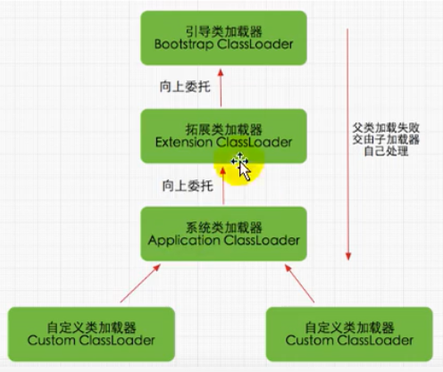 》如果父类加载器还存在其父类加载器,则进一步向上委托,依次递归,请求最终将到达顶层的启动类加载器;