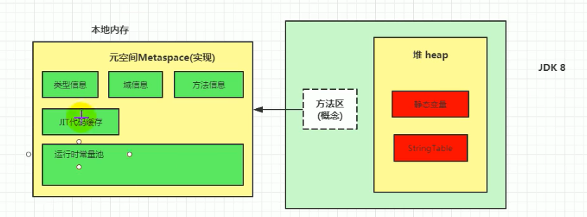 jdk1.8及以后:无永久代,类型信息、字段、方法、常量保存在本地内存的元空间,但字符串常量池、静态变量仍在堆中