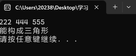 #include <stdio.h> #include <stdlib.h> int main() { int a, b, c; scanf("%d%d%d", &a, &b, &c); if (a + b > c && a + c > b && b + c > a) printf("能构成三角形\n"); else printf("不能构成三角形\n"); system("pause"); return 0; }