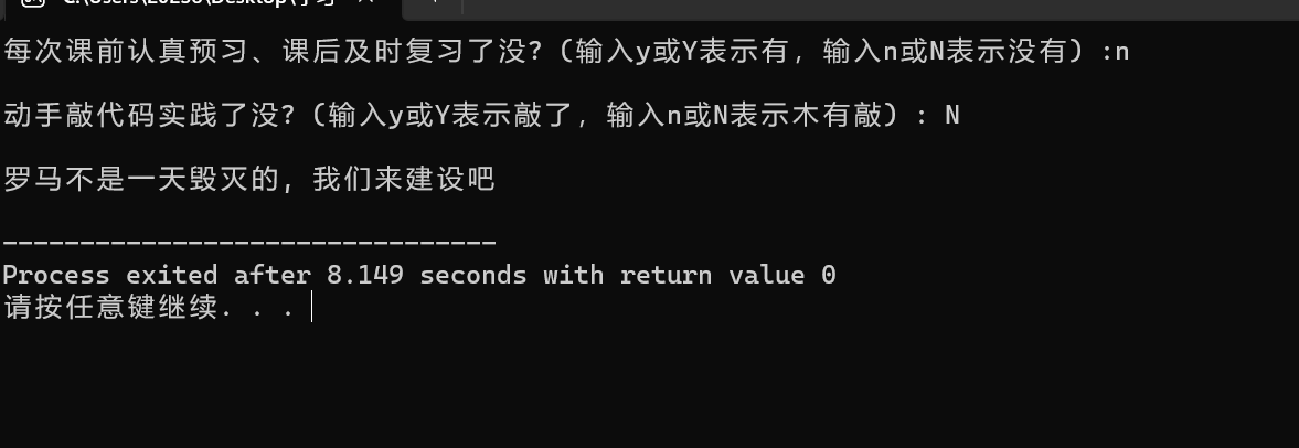 #include <stdio.h> #include <stdlib.h> int main() { char ans1, ans2; printf("每次课前认真预习、课后及时复习了没? (输入y或Y表示有,输入n或N表示没有) :"); ans1 = getchar(); getchar(); printf("\n动手敲代码实践了没? (输入y或Y表示敲了,输入n或N表示木有敲) : "); ans2 = getchar(); if ((ans1=='y'||'Y') && (ans2=='y'||'Y'))// 待补足,判断用户回答ans1和ans2都是小写y或大写Y printf("\n罗马不是一天建成的, 继续保持哦:)\n"); else printf("\n罗马不是一天毁灭的, 我们来建设吧\n"); system("pause"); return 0; }