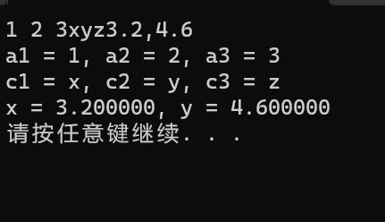 #include <stdio.h> #include <stdlib.h> int main() { double x, y; char c1, c2, c3; int a1, a2, a3; scanf("%d %d %d", &a1, &a2, &a3); printf("a1 = %d, a2 = %d, a3 = %d\n", a1, a2, a3); scanf("%c%c%c", &c1, &c2, &c3); printf("c1 = %c, c2 = %c, c3 = %c\n", c1, c2, c3); scanf("%lf,%lf", &x, &y); printf("x = %lf, y = %lf\n", x, y); system("pause"); return 0; }