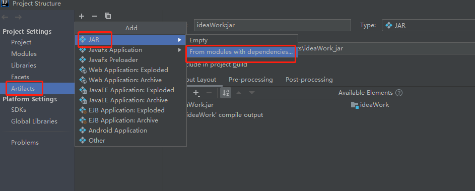 4、选择Artifacts,并选择上面的+号,选择JAR,然后再选择第二个