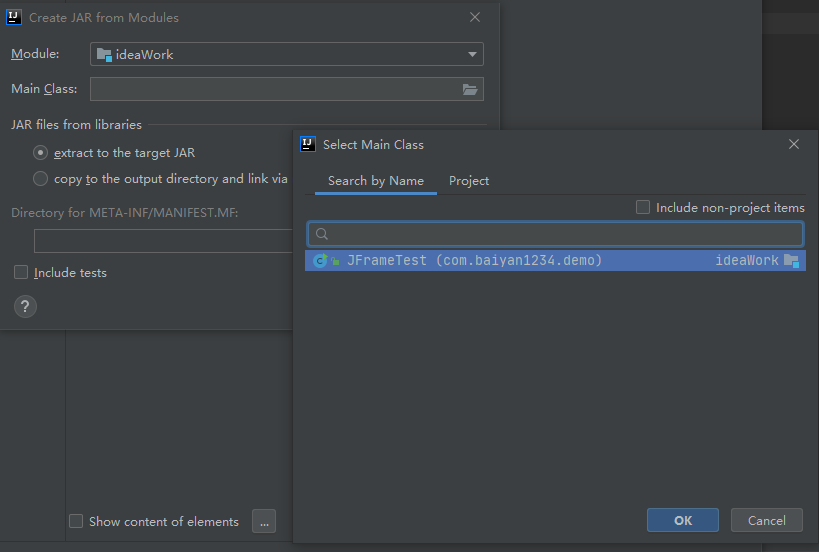 5、填写MainClass,选择JFrameTest这个类,点击ok