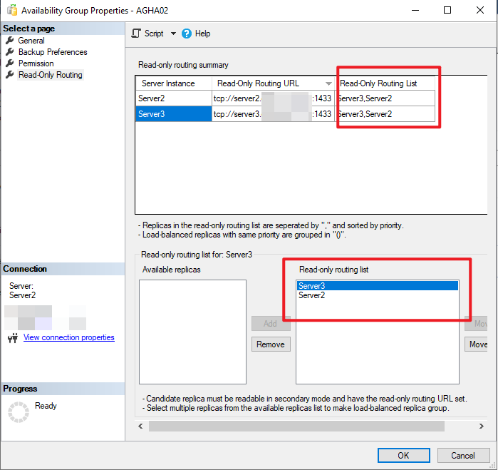 那么Server2的read-only routing list为Server3和Server2,通过侦听器连接到Always On群里的时候,当连接串中指定ApplicationIntent=ReadOnly的时候,会从Server3和Server2中优先选择Server3作为只读节点,为了防止Server3宕机 ,次优先选Server2,也即自身
