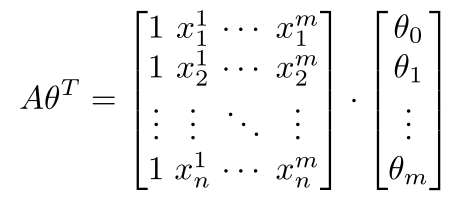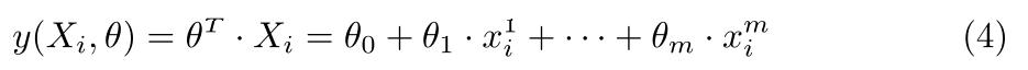 实际情况是,我们的样本集合往往有多个相关变量X=[1,x1,x2,...,xm](考虑到矩阵乘法的实际意义,往往令该向量的第一个元素为1),多个参数θ=[θ0,θ1,...,θm],则可以推广到如下的线性形式: