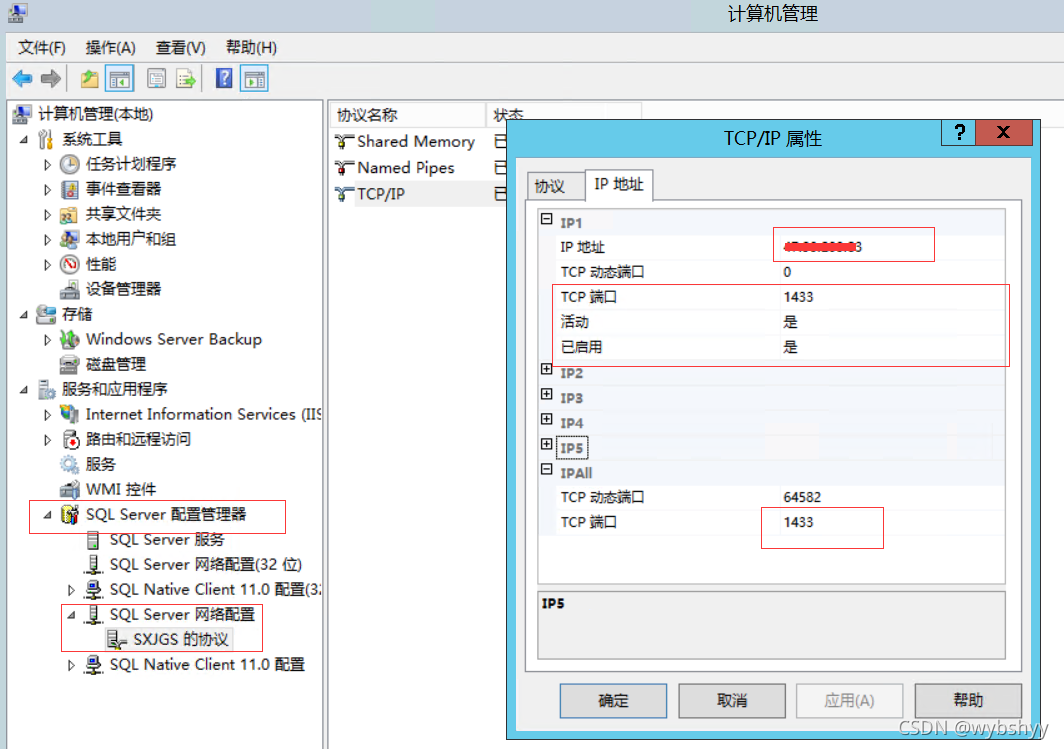 二:服务器上 win + R 键入 compmgmt.msc ,打开 计算机管理》服务和应用程序》SQL Server配置管理器》SQL Server网络配置》***协议