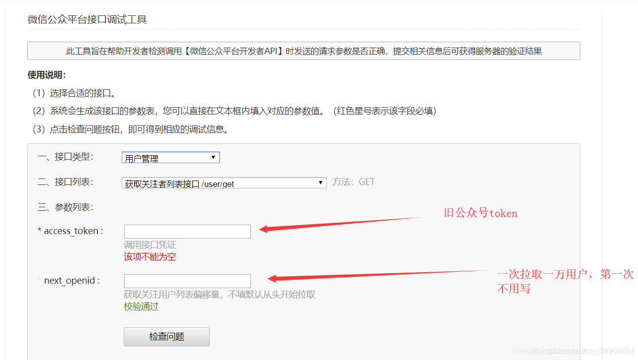 https://api.weixin.qq.com/cgi-bin/user/get?access_token=ACCESS_TOKEN&next_openid=NEXT_OPENID