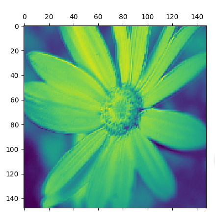 #建立模型,输入为原图像,输出为原模型的前8层的激活输出的特征图 layer_outputs = [layer.output for layer in model.layers[:8]] activation_model = models.Model(inputs=model.input, outputs=layer_outputs) #获得改样本的特征图 activations = activation_model.predict(img_tensor) #显示第一层激活输出特的第一个滤波器的特征图 first_layer_activation = activations[0] plt.matshow(first_layer_activation[0,:,:,1], cmap="viridis")