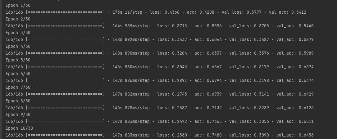 其次在编写图像预处理代码过程中,参考猫狗识别代码将"class_mode"的值写成了"binary"也导致了程序运行时报错。如果是二分类应写为:class_model=“binary”,如果是多分类应写为class_model=“categorical”,查阅了相关资料了解后更改class_model的值代码果然运行成功。