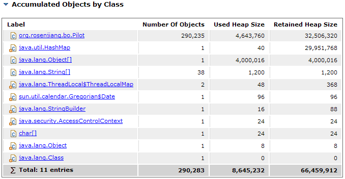 接着往下看,来到了Accumulated Objects by Class区域,顾名思义,这里能找到被聚集的对象实例的类名。org.rosenjiang.bo.Pilot类上头条了,被实例化了290,325次,再返回去看程序,我承认是故意这么干的。还有很多有用的报告可用来协助分析问题,只是本文中的例子太简单,也用不上。以后如有用到,一定撰文详细叙述。
