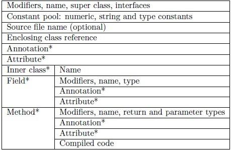 Exception in thread "main" java.lang.OutOfMemoryError: PermGen space倒是在思考如何把class loader撑破废了些心思。经过尝试,发现使用ASM来动态生成类才能达到目的。ASM(http://asm.objectweb.org)的主要作用是处理已编译类(compiled class),能对已编译类进行生成、转换、分析(功能之一是实现动态代理),而且它运行起来足够的快和小巧,文档也全面,实属居家必备之良品。ASM提供了core API和tree API,前者是基于事件的方式,后者是基于对象的方式,类似于XML的SAX、DOM解析,但是使用tree API性能会有损失。既然下面要用到ASM,这里不得不啰嗦下已编译类的结构,包括: