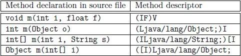这里还得说说已编译类对Java类型的描述,对于原始类型由单个大写字母表示,Z代表boolean、C代表char、B代表byte、S代表short、I代表int、F代表float、J代表long、D代表double;而对类类型的描述使用内部名(internal name)外加前缀L和后面的分号共同表示来表示,所谓内部名就是带全包路径的表示法,例如String的内部名是java/lang/String;对于数组类型,使用单方括号加上数据元素类型的方式描述。最后对于方法的描述,用圆括号来表示,如果返回是void用V表示,具体参考下图。