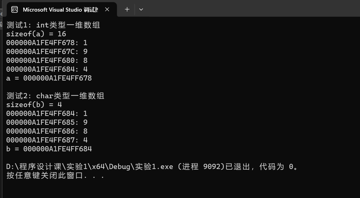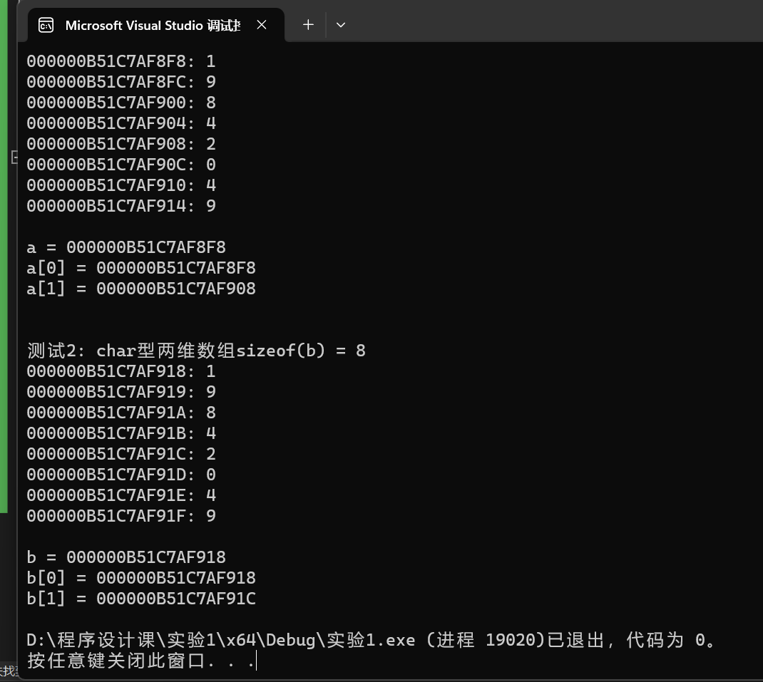#include <stdio.h> #define N 4 void test1() { int a[N] = { 1, 9, 8, 4 }; int i; // 输出数组a占用的内存字节数 printf("sizeof(a) = %d\n", sizeof(a)); // 输出int类型数组a中每个元素的地址、值 for (i = 0; i < N; ++i) printf("%p: %d\n", &a[i], a[i]); // 输出数组名a对应的值 printf("a = %p\n", a); } void test2() { char b[N] = { '1', '9', '8', '4' }; int i; // 输出数组b占用的内存字节数 printf("sizeof(b) = %d\n", sizeof(b)); // 输出char类型数组b中每个元素的地址、值 for (i = 0; i < N; ++i) printf("%p: %c\n", &b[i], b[i]); // 输出数组名b对应的值 printf("b = %p\n", b); } int main() { printf("测试1: int类型一维数组\n"); test1(); printf("\n测试2: char类型一维数组\n"); test2(); return 0; }