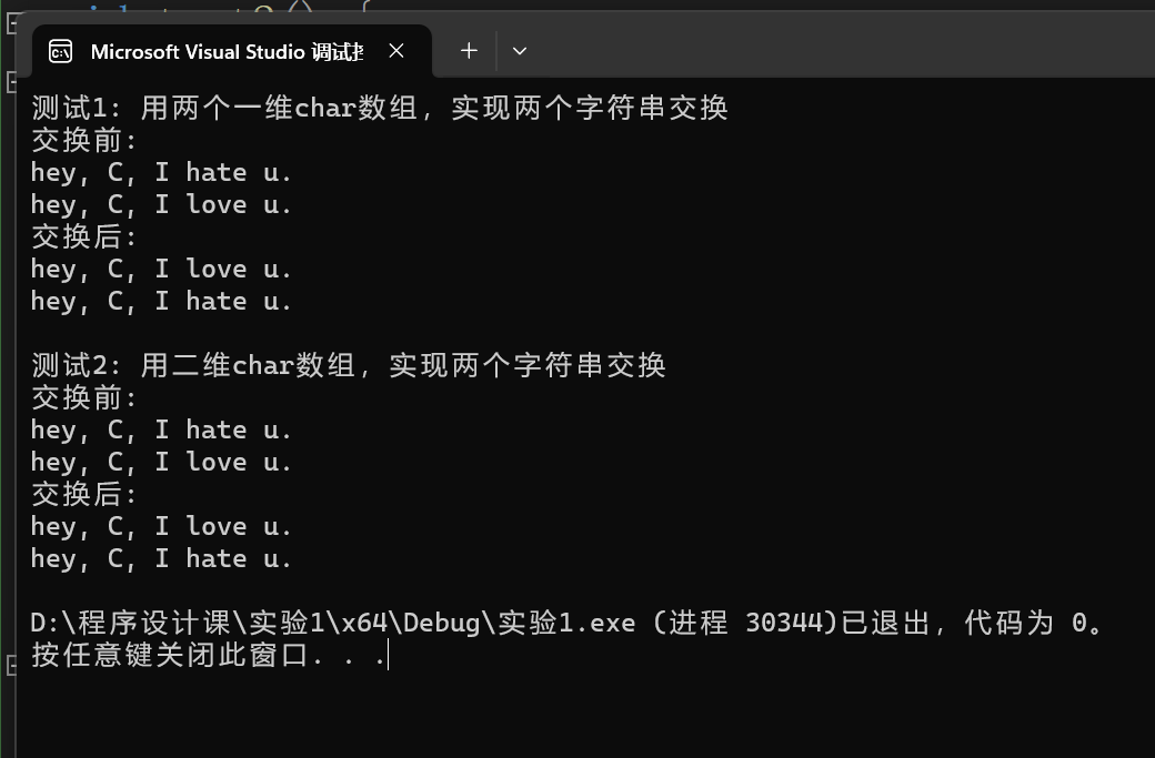 #include <stdio.h> #include <string.h> #define N 80 void swap_str(char s1[N], char s2[N]); void test1(); void test2(); int main() { printf("测试1: 用两个一维char数组,实现两个字符串交换\n"); test1(); printf("\n测试2: 用二维char数组,实现两个字符串交换\n"); test2(); return 0; } void test1() { char views1[N] = "hey, C, I hate u."; char views2[N] = "hey, C, I love u."; printf("交换前: \n"); puts(views1); puts(views2); swap_str(views1, views2); printf("交换后: \n"); puts(views1); puts(views2); } void test2() { char views[2][N] = { "hey, C, I hate u.", "hey, C, I love u." }; printf("交换前: \n"); puts(views[0]); puts(views[1]); swap_str(views[0], views[1]); printf("交换后: \n"); puts(views[0]); puts(views[1]); } void swap_str(char s1[N], char s2[N]) { char tmp[N]; strcpy(tmp, s1); strcpy(s1, s2); strcpy(s2, tmp); }
