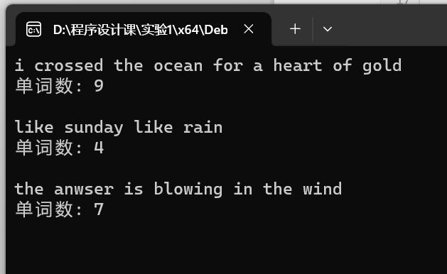 #include <stdio.h> #define N 80 int count(char x[]); int main() { char words[N + 1]; int n; while (gets(words) != NULL) { n = count(words); printf("单词数: %d\n\n", n); } return 0; } int count(char x[]) { int i; int word_flag = 0; // 用作单词标志,一个新单词开始,值为1;单词结束,值为0 int number = 0; // 统计单词个数 for (i = 0; x[i] != '\0'; i++) { if (x[i] == ' ') word_flag = 0; else if (word_flag == 0) { word_flag = 1; number++; } } return number; }