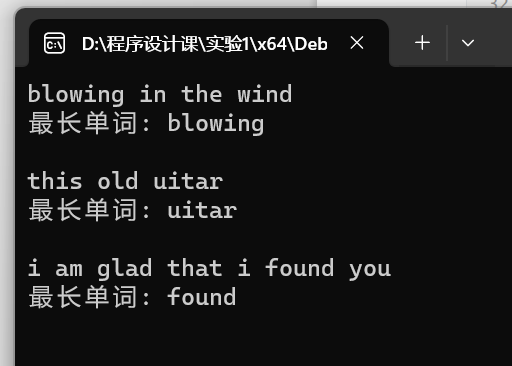 #include <stdio.h> #define N 1000 int main() { char line[N]; int word_len; // 记录当前单词长度 int max_len; // 记录最长单词长度 int end; // 记录最长单词结束位置 int i; while (gets(line) != NULL) { word_len = 0; max_len = 0; end = 0; i = 0; while (1) { // 跳过连续空格 while (line[i] == ' ') { word_len = 0; // 单词长度置0,为新单词统计做准备 i++; } // 在一个单词中,统计当前单词长度 while (line[i] != '\0' && line[i] != ' ') { word_len++; i++; } // 更新更长单词长度,并,记录最长单词结束位置 if (max_len < word_len) { max_len = word_len; end = i; // end保存的是单词结束的下一个坐标位置 } // 遍历到文本结束时,终止循环 if (line[i] == '\0') break; } // 输出最长单词 printf("最长单词: "); for (i = end - max_len; i < end; ++i) printf("%c", line[i]); printf("\n\n"); } return 0; }