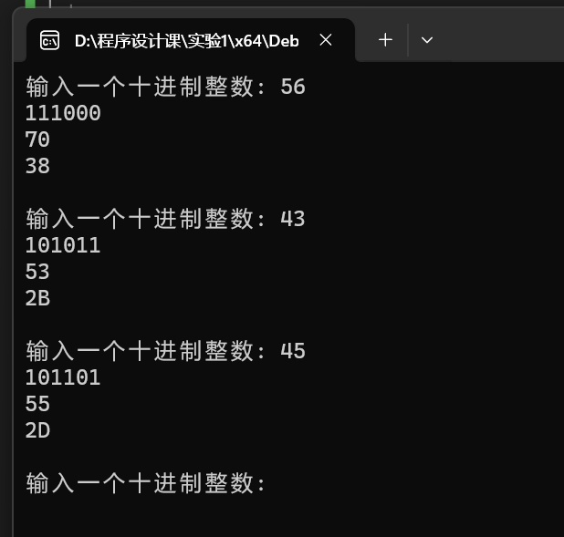 #include <stdio.h> #define N 100 void dec_to_n(int x, int n); // 函数声明 int main() { int x; printf("输入一个十进制整数: "); while(scanf("%d", &x) != EOF) { dec_to_n(x, 2); // 函数调用: 把x转换成二进制输出 dec_to_n(x, 8); // 函数调用: 把x转换成八进制输出 dec_to_n(x, 16); // 函数调用: 把x转换成十六进制输出 printf("\n输入一个十进制整数: "); } return 0; } void dec_to_n(int x, int n){ char map[16] = {"0123456789ABCDEF"}; int ans[N]; int i=0, j, r; do{ r = x%n; ans[i++]=map[r]; x = x/n; }while(x != 0); for(j=i-1;j>=0;--j) printf("%c",ans[j]); printf("\n"); }